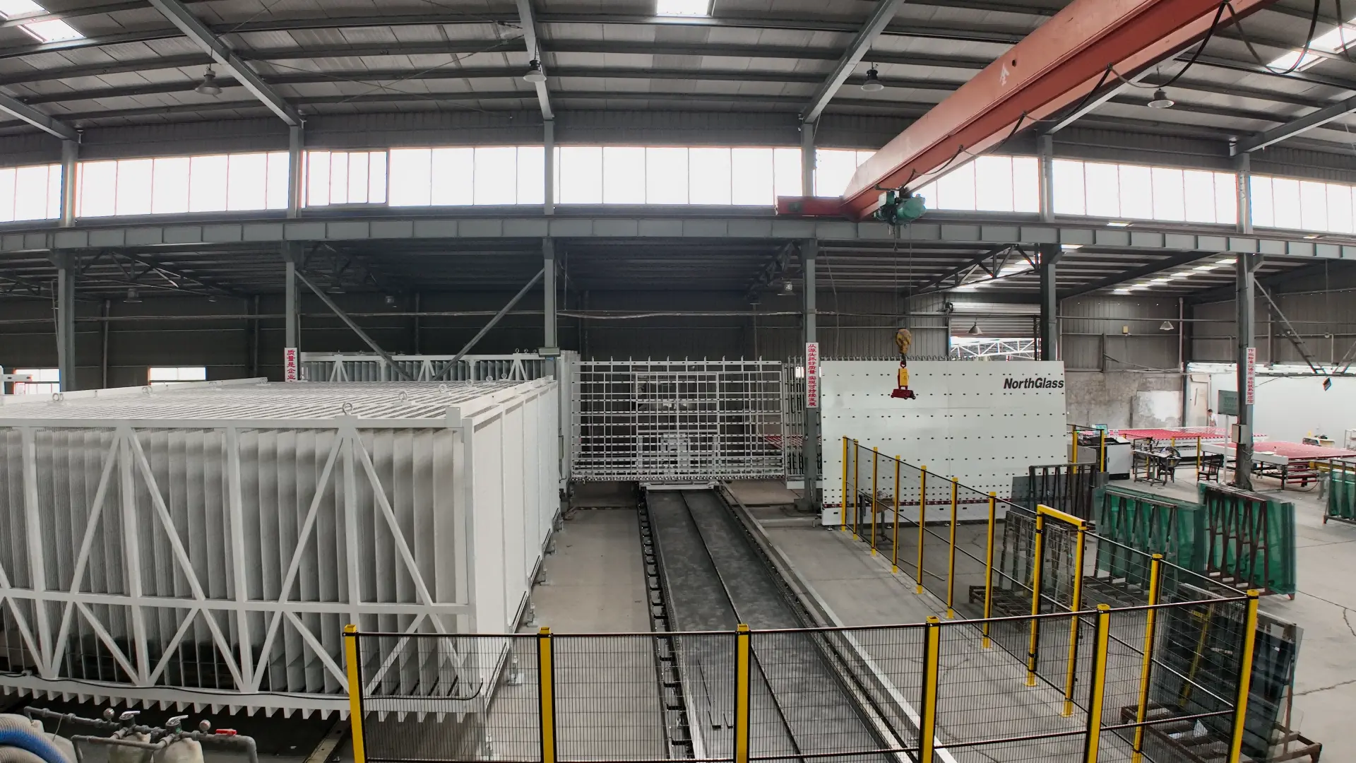 切割机++卧式理片(9层)+磨边清洗+立式理片+钢化自动摆片+钢化炉+钢化自动分片+机器人下片