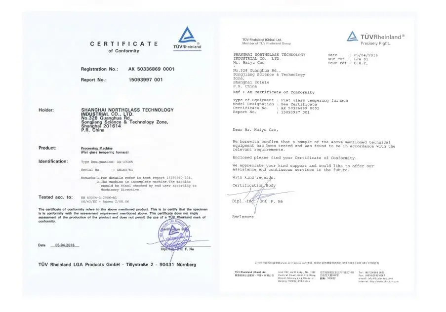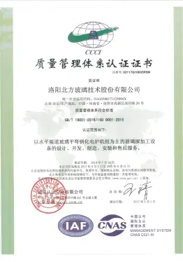 2002年已通过GB/T19001-2000/s09001-2000质量管理体系认证,目前通过GB/T19001-2016/1s09001-2015质量管理体系认证,符合国际标准的质量管理体系的有效运行, 是北玻设备在市场拥有良好口碑的基础和保证。2015年通过UL美华第三方认证,获得UL认证证书,2016年通过TUV莱茵公司认证,获得CE认证证书。相继通过全球技术要求最高的欧洲和北美的安全认证,能帮助北玻更加顺利地开拓和扩大在全球各地的销售业绩。