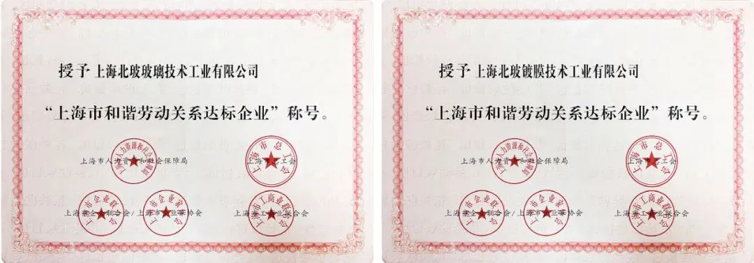 近日,北玻股份旗下上海北玻玻璃技术工业有限公司、上海北玻镀膜技术工业有限公司均荣获“上海市和谐劳动关系达标企业”称号。本次评选是由上海市人力资源和社会保障局等十余家单位对参评企业的规范性、建设性、发展性和感受性等70多个指标进行全方位测评,北玻实力入选。