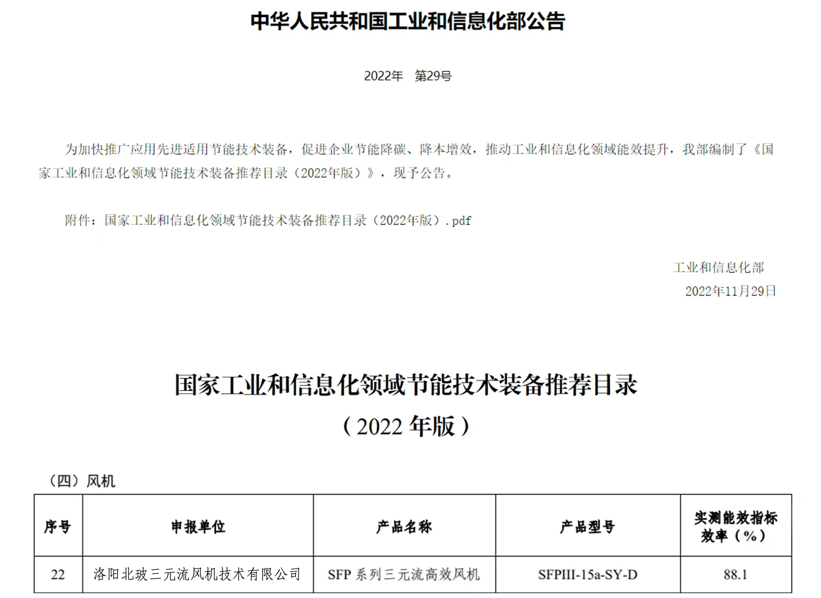 2022年12月1日,洛阳北玻三元流风机技术有限公司成功入选《国家工业和信息化领域节能技术装备目录(2022年版)》。