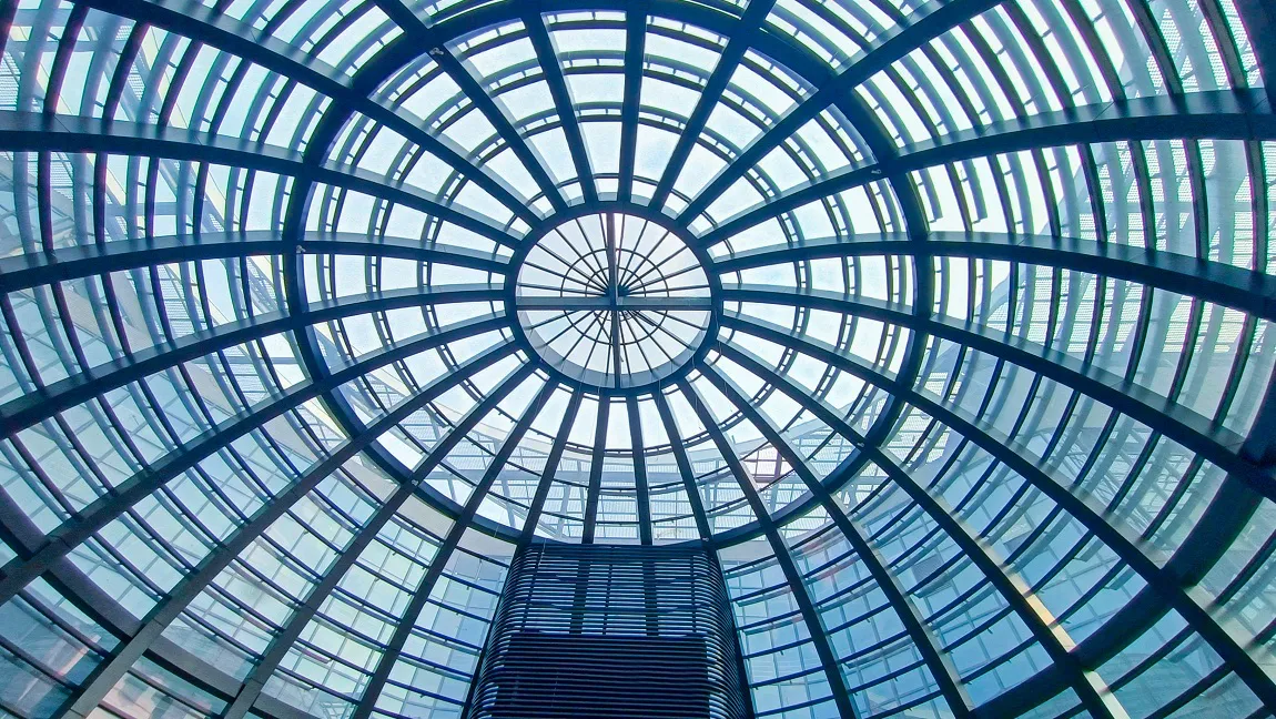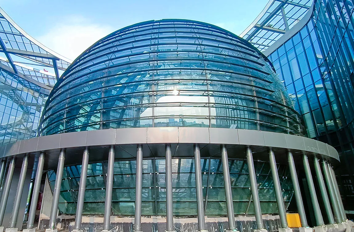 科技馆的入口位于整个场馆的中心位置,科技感十足,597块双银Low-E钢化夹层复合中空玻璃构成了一个24.6米直径的巨大球体。北玻利用自主研发的弯钢成型技术,打造出完美边部弧形曲线,对弧状精度以及叠差控制极其精准。