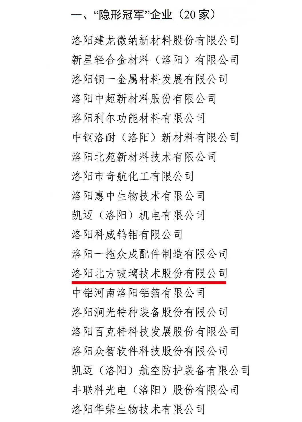 近日,洛阳市工业和信息化局经县区推荐、部门审核、实地查看、网上公示等程序,针对各个细分领域评选出20家2022年度洛阳市“隐形冠军”企业。洛阳北玻作为玻璃深加工行业代表获得此项殊荣!