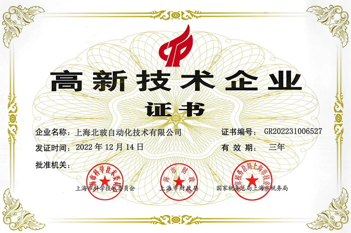 近日,上海北玻自动化技术有限公司通过了由科技厅、财政厅和国家税务机关组织的国家高新技术企业认定,并荣获国家“高新技术企业”称号。