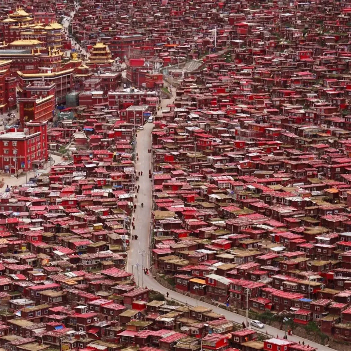 作品介绍:密密麻麻的僧舍,层檐高耸的经堂,公路穿行其间,串联起这座信仰筑起的红城。
