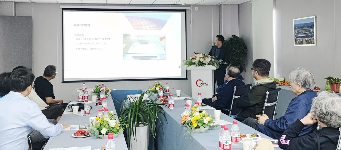 4月1日下午,考察交流团在蒋维以及李春超的陪同下,来到洛阳北玻轻晶石技术有限公司,走进车间厂房,对北玻轻晶石的加工制作流程和成品的安装应用等进行了全方位的深入了解,并参观了由北玻轻晶石和玻璃等组成的装配式房屋实体。总经理蒋维从轻晶石的生产原料、生产过程、加工过程到应用案例向大师们做了全面、细致地介绍。