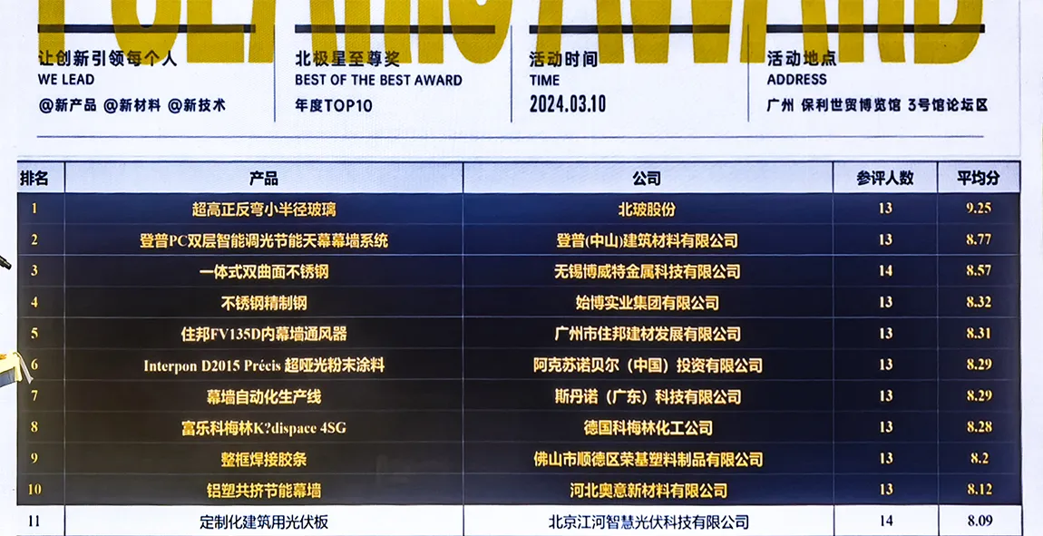2024全国铝门窗幕墙行业年会暨中国建筑金属结构协会铝门窗幕墙分会成立30周年庆典于3月10日在广州召开。会议同期发布了2023-2024年度建筑门窗幕墙行业大数据“TOP10”品牌入库(建筑玻璃类)上榜企业,北玻成功上榜并在“首选品牌”推荐活动中连续第十八次蝉联“建筑玻璃十大首选品牌”大奖。北玻股份副总裁高琦受邀主持会议。