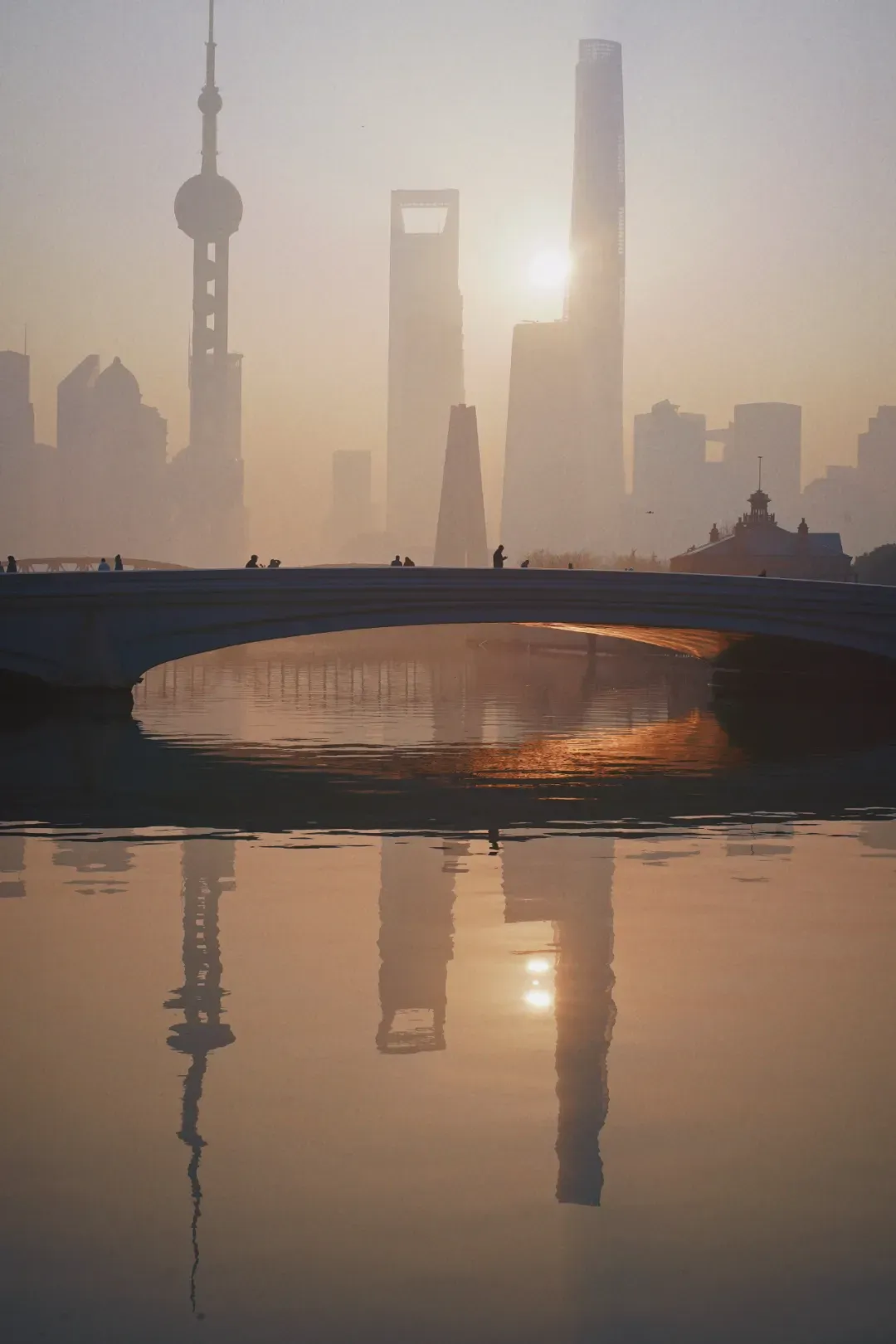 作品介绍:清晨的薄雾笼罩江岸,太阳从陆家嘴建筑群间升起,倒影照亮乍浦路桥,让桥体和拍日出的人浓缩成剪影。