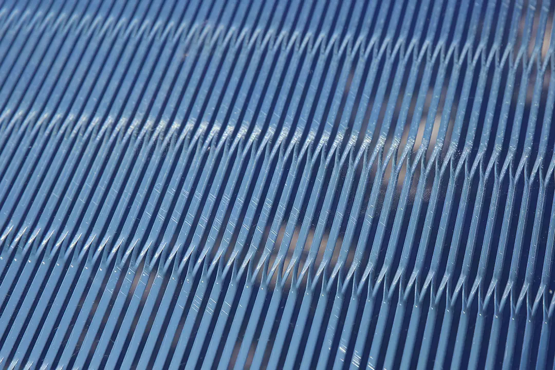航站楼顶层这2342块中空节能玻璃,内置超宽铝网,这些统一向北排列的铝网不仅可以遮挡阳光,同时又能满足航站楼的自然采光需求,节能环保。铝质遮阳网采用3系合金铝材料加工而成,均为异形铝网,整个幕墙玻璃项目中难度最大之处就在于此,仅仅超宽內置金属网中空玻璃的制作工序就非常繁复。