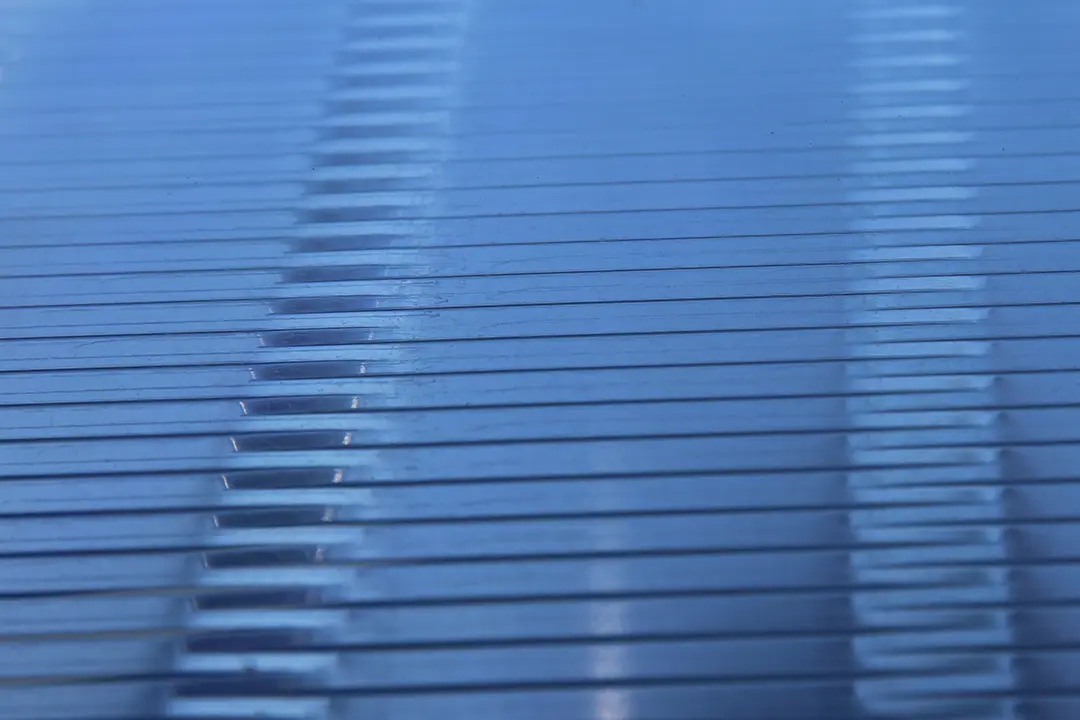 俯看新机场主航站楼屋面,一副绚丽的“海星”图案,五座指廊与航站楼主体像海星触须向外绵延,散落其中的是八点“水滴”。这就是具备绿色节能功能的屋面玻璃幕墙系统,它是由一个中央天窗、六条条形天窗和八个气泡窗组成的自然采光体系。北京新机场项目中难度最大的采光顶玻璃全部由北玻股份天津玻璃公司提供,共有彩釉钢化结构节能玻璃8632块,其中超宽內置金属遮阳网的中空节能玻璃2342块。