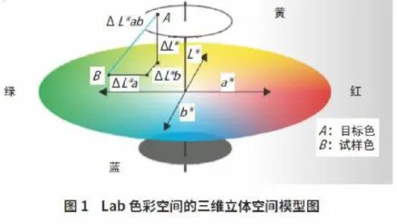 在CIELAB颜色空间中,不同区域的色差容限相对比较接近,颜色样品在此空间中的位置由三维直角坐标表示。L*、、b*的值可以从三刺激值(X、Y、Z)计算出来,其中L*表示颜色的明度,表示该颜色在红-绿色轴方向的投影位置,b*表示颜色在黄蓝色轴方向的投影位,置。由于色度系统CIELAB极大地改善了CIE1931色度系统的不均匀性,从而使得采用色度学来对产品颜色质量进行评价就有了可行性。工业界基于CIELAB 色差公式制定了最初的针对颜色测量和色差评价的国际标准。我国也根据国际标准制定了与之对应的各个行业标准。在建筑玻璃领域,根据GB/T18915.1- -2013《镀膜玻璃》的规定,镀膜玻璃的颜色均匀性用CIELAB均匀色空间的色差表示,应<2.5。从空间角度而言,即两个检测点在空间坐标系中的直线距离(以L*、、b*为坐标值) s2.5。Lab (颜色模型)色彩空间的三维立体空间模型如图1所示。