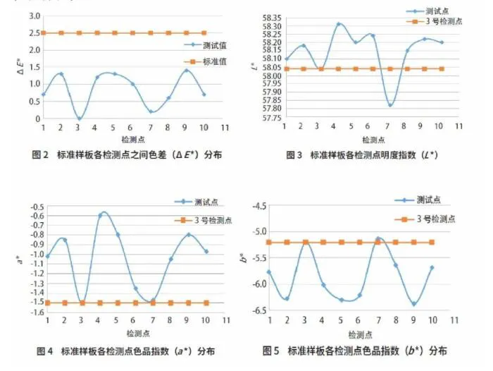 根据各检测点之间色差分布情况可知,标准样板各区域内颜色均匀性情况良好,色差(△E*)在1.5以内。根据各检测点明度指数、色品指数曲线可以看出,标准样板各测点间,各检测点明度指数L*、色品指数a*呈。正偏差趋势;色品指数b*呈负偏差趋势,即各检测点相较中心点而言会呈现偏红、偏蓝,但偏差值均<1.5。