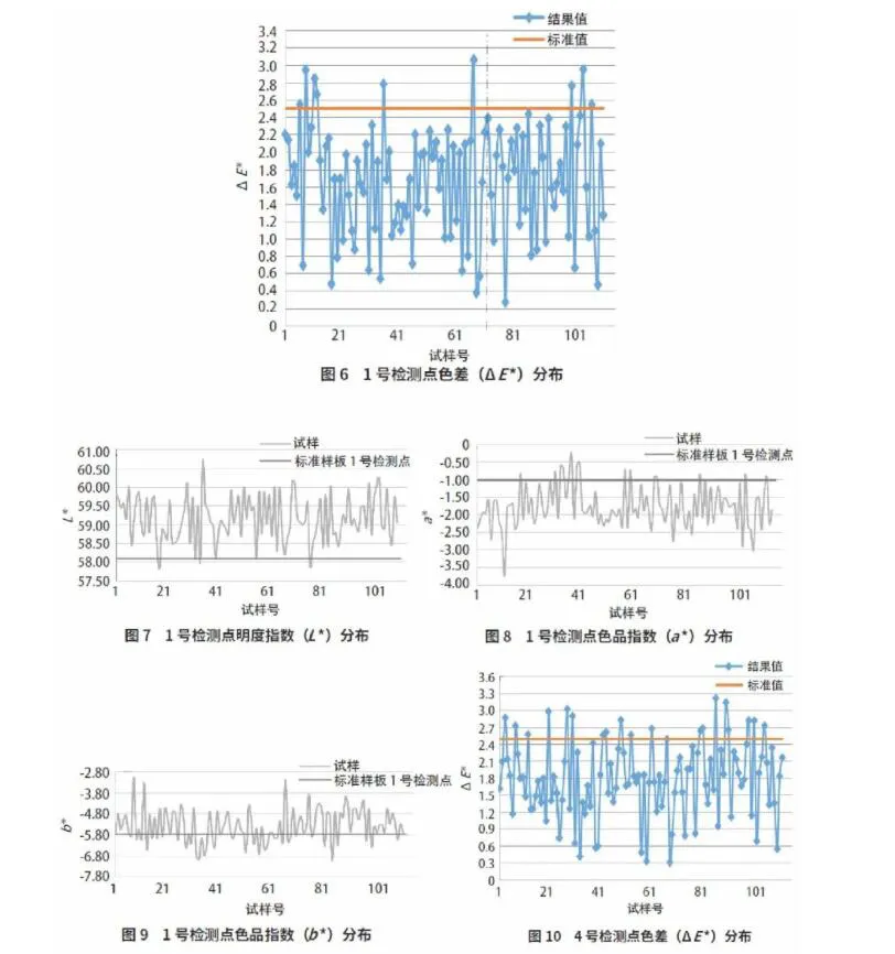 从各检测点的对比图谱可以看出,大部分检测样板检测点的色差(△E*)在标准规定的范围之内,但进一步观察明度和色品指数,会发现,样板对应位置的明度值普遍高于标准样板上的值,色品指数(a*)坐标位于负向坐标轴,色品指数(b*) 坐标位于正向坐标轴。且从1号 和4号检测点图谱分布来看,其色品指数(b*)本身存在不稳定性。因此,检测结果中的色差(△E*)总体满足规定要求,但对应检测点的颜色与标准样板比较会偏绿色和黄色,视觉感官上仍旧存在差异。通过进一步分析色差(△E*)分布,各检测样板中色差较为集中的区域为2、4、5号检测点。其中2号、5号检测点位于检测样板的同侧区域,且均在右侧区域;4号、5号检测点位于检测样板的同侧区域,且均在下方区域。同时,对单块检测样板内部各检测之间的色差(△E*)进行比对,发现2号检测点与3、4、5号检测点之间的色差(△E*)问题较为集中。