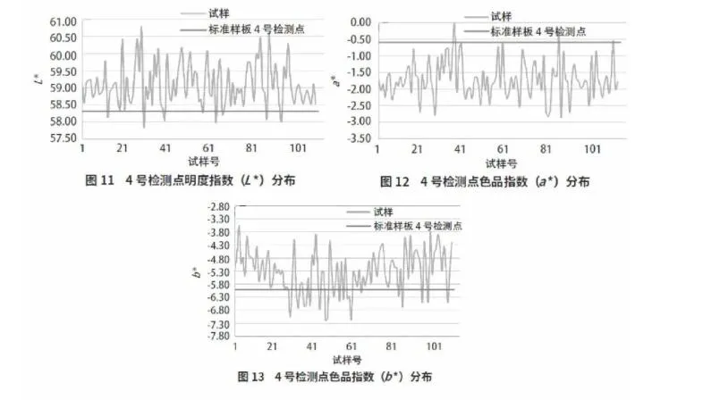 通过检测111块检测样板表面各检测点的明度指数、色品指数,与标准样板进行对比,绘制相应的图谱,以1号、4号检测点图谱分布为例,见图6~图13。