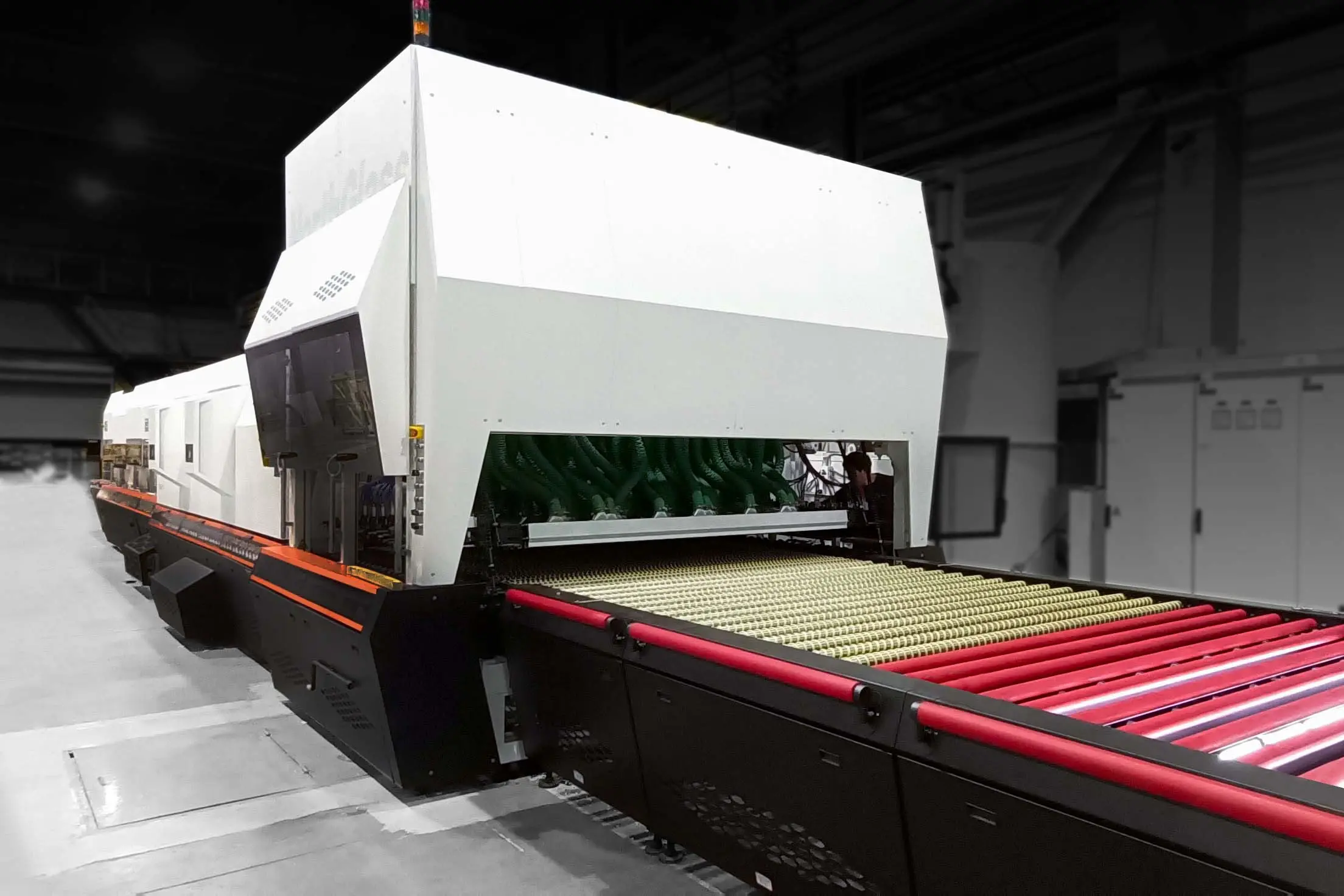 加热段是玻璃钢化炉的核心,它利用电加热或燃气加热元件将玻璃加热至接近其软化点的温度。这一过程需要准确控制,以确保玻璃均匀受热,为后续的快速冷却打下基础。加热段的设计通常包括多个加热区,以适应不同厚度和类型的玻璃。