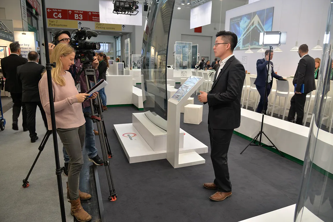 前来参观BAU展的观众一来到北玻展台,映入眼帘的就是一块弧长8米、高3.3米的超大弯钢玻璃,在这块玻璃面前,大家都惊叹不已,纷纷举起手中相机。不少观众前来洽谈咨询,了解到眼前这块超级展品最小半径只有4米时,大家都啧啧称奇。同时,北玻展台展出的还有“气垫玻璃”(已经应用到上海Nike 001旗舰店)、双曲面Low-E钢化玻璃、S型SGP夹层热弯玻璃(半径180mm)、半圆热弯玻璃(半径175mm),当得知这些精美的玻璃都是来自中国时,很多人都目瞪口呆,更有甚者都不敢相信中国能有如此高超的制造工艺和加工水准。一位80年代去过中国的国外观众,特意来到北玻展台,说在他的印象里30年前中国的工业基础基本是零:“现在你们的发展速度太快了,能在这里看到这些来自中国的玻璃 ‘艺术品’ 真是太棒了。”