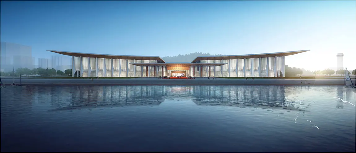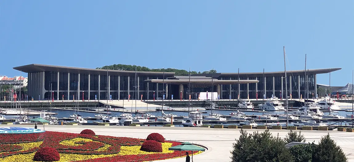 此次会议的主会场位于山东省青岛市奥帆中心内,总用地面积3.1万平方米,基地南北长约273米,东西宽约70米。主会场的设计灵感来自青岛翱翔的海鸥、海面遨游的帆船,以“腾飞逐梦、扬帆领航”为设计立意,以抽象、现代的建筑造型传神再现中国传统元素与地域海洋文化特性,共同融合成具有独特性、标志性、文化性、生态性的建筑形体。建筑物远看就像一只飞翔在鳞次栉比的船帆上方的巨大海鸥,通体的超白玻璃幕墙,令宾客与海与山进行互动,感受背山面海、海天一色、蓝绿相映的壮美景象。