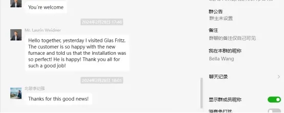 上述这段话出自钢化设备事业部国际销售+服务办公群,德国代理很欣喜地向大家分享了德国客户对北玻团队的赞誉。(译文:昨天我拜访了格拉斯·弗里茨。客户对新炉子非常满意,并告诉我们安装的非常完美!他很开心!谢谢大家的出色工作!)