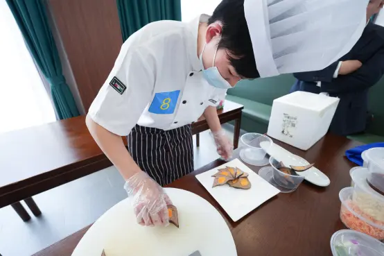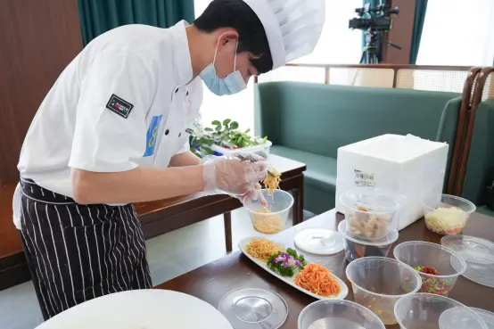 还有加入北玻餐厅不久的周贵华,特别擅长徽菜以及川菜的制作,目前在北玻小馆当主厨,一道“银杏穿红袍”更是轻松拿捏了现场女性评委的味蕾。在烹饪过程中,两位帮厨张杰和王志写,运用各种自备食材,从切菜、食材搭配,到起锅、颠勺等每一个环节,都表现得游刃有余,协助团队出色的完成了参赛菜品。他们的手法熟练而不失细腻,速度适中而精准,刀落之处,食材变换形态,香气四溢,令人垂涎。