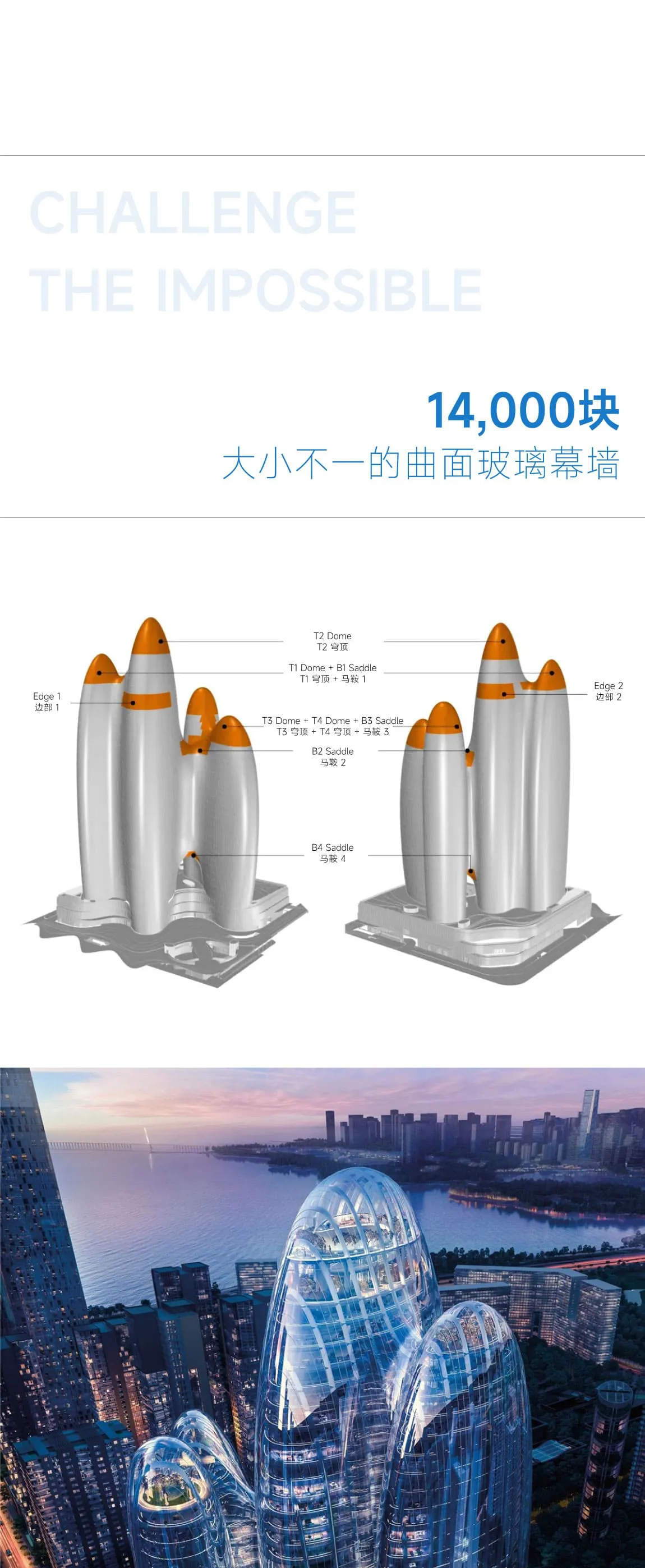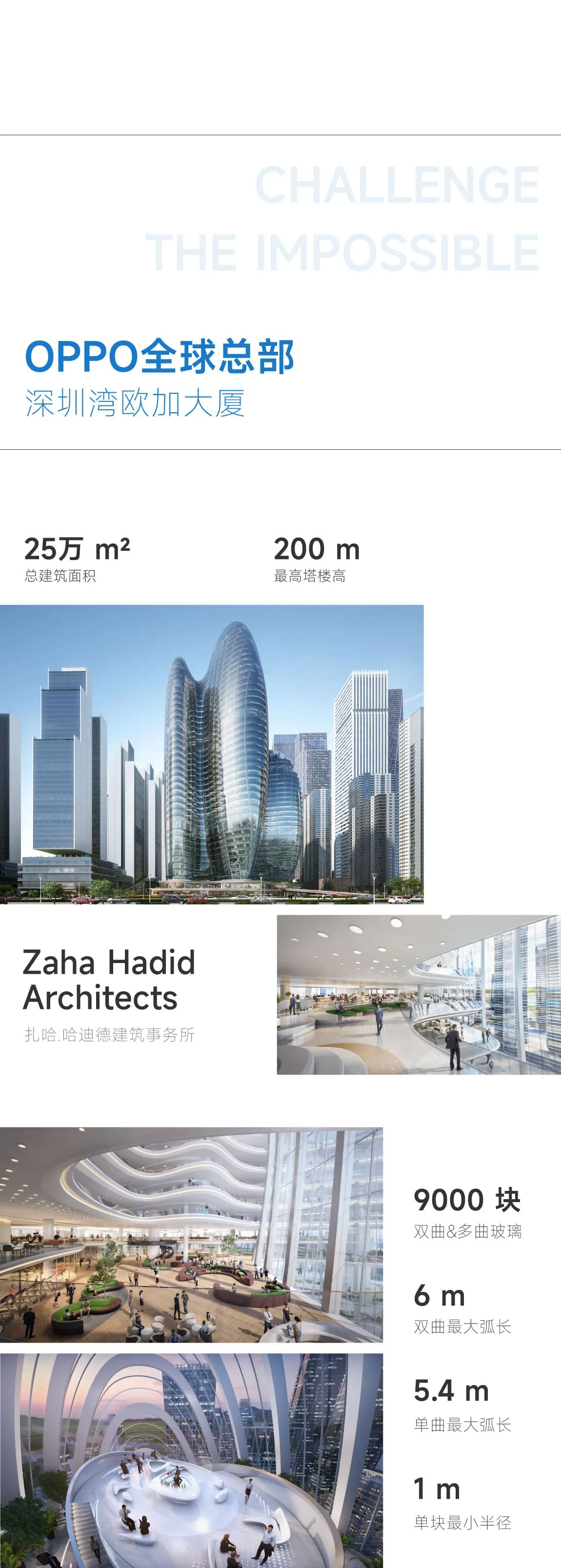 OPPO全球总部共计约7万㎡玻璃,包括近1.4万块曲面玻璃其中9千块极具难度的双曲、多曲面、反弯马鞍状玻璃以及屋顶球状弯弧玻璃,单曲最大弧长5.4米,双曲最大弧长达到6米,单块最小半径为1米。精度和加工要求极为严苛,其复杂性和精度堪称业内天花板。
