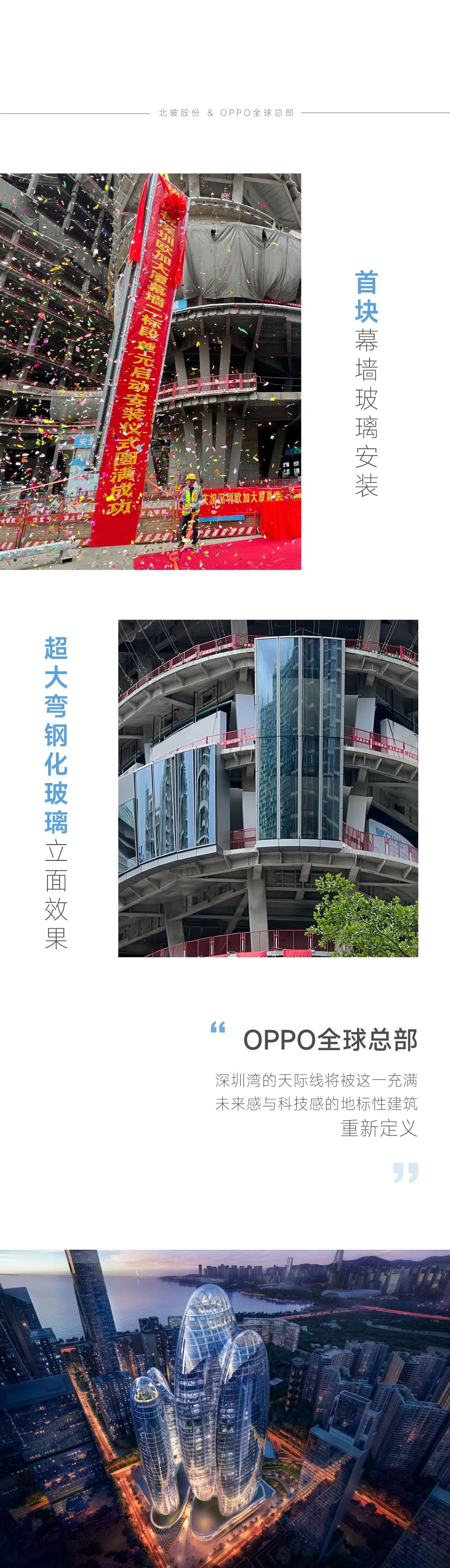 OPPO全球总部预计2025年建成,建成后将为未来建筑的可能性提供了全新方向。深圳湾的天际线将被这一充满未来感与科技感的地标性建筑重新定义。未来,北玻将以此项目为动力,继续深化技术研发,以卓越的工艺与实力推动幕墙玻璃行业的变革,为更多世界级建筑项目贡献力量。