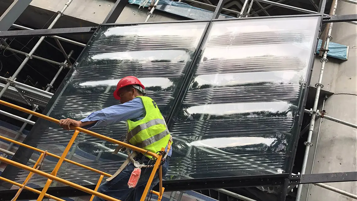 为了能够保证玻璃品质,让客户满意,天津玻璃公司分别与中国建材研究院、中国建筑科学研究院进行技术合作,生产前期做了大量的实验和准备工作,生产过程中技术人员全程跟踪,产品生产出来又进行了逐片检测,在各项指标均达到设计要求后,交付客户手里进行安装,最终呈现出这炫丽的效果。