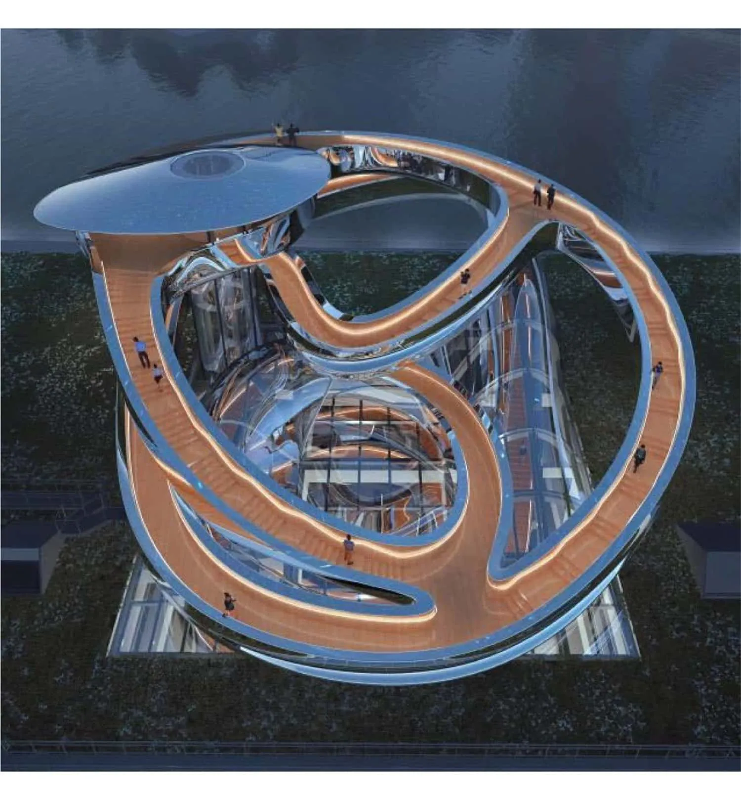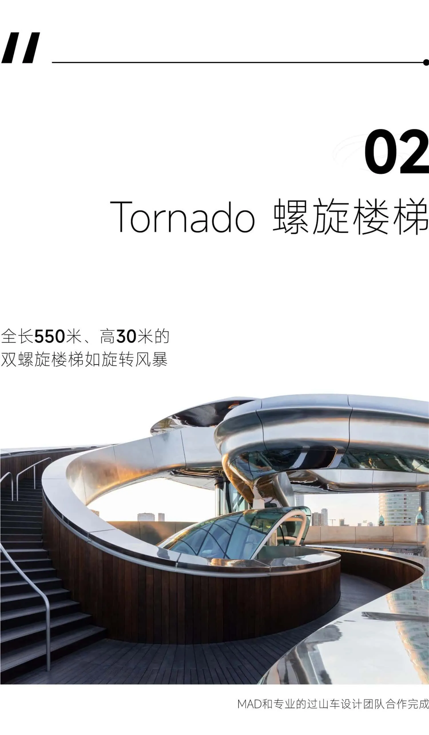 作为观景平台的重要组成部分,“龙卷风”不仅具备实用功能,也为整个空间注入强烈的艺术感。自然光透过玻璃洒入展厅,与“龙卷风”结构上覆盖的不锈钢板相互反射,形成丰富光影效果。
