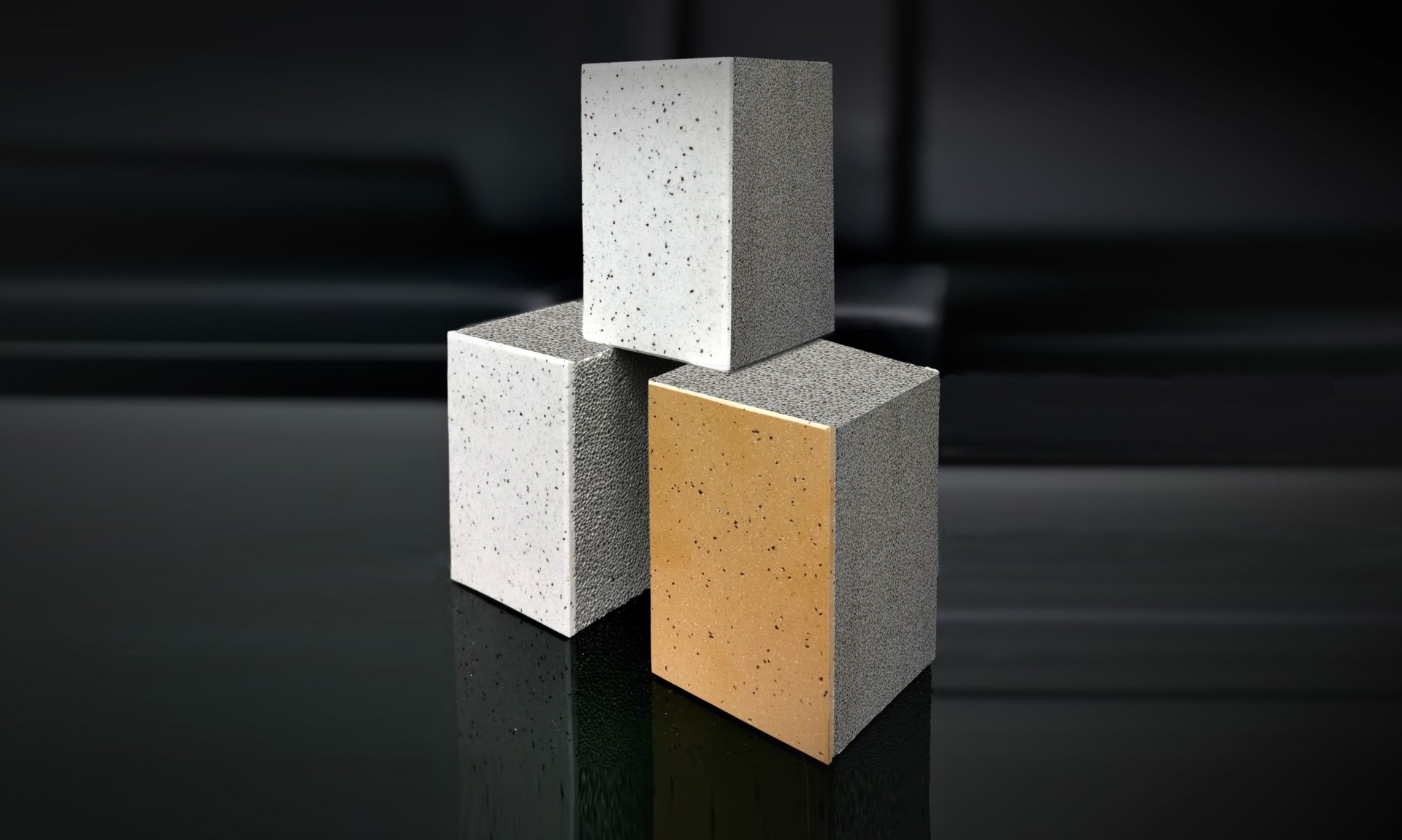 轻质微晶石简称轻晶石,是硅基原料经高温一体烧结的新型建筑墙体材料。基层呈蜂巢状,面层为微晶石,兼具石材坚固华美与轻盈保温特性。原板规格1200×1600×100mm,绿色生产无废气排放,100% 可回收循环利用。