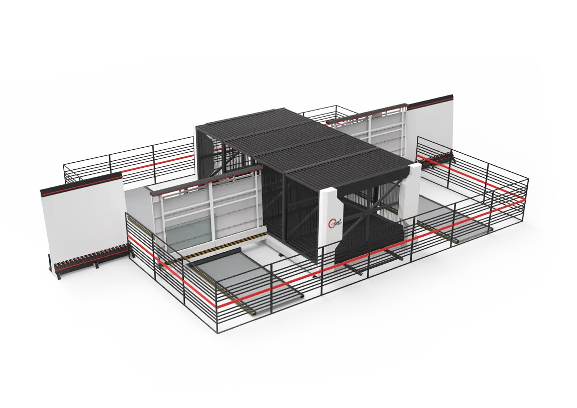 功能特点:由提升输送台,理片笼,笼边提升车和控制系统组成,玻璃可以水平存储在一层层的栅格内,存储的层数向空中发展,最高可达到9米,大大减小了设备的占地空间。作为钢化前的缓存,同时可以配合软件系统进行钢化前的自动优化摆炉。